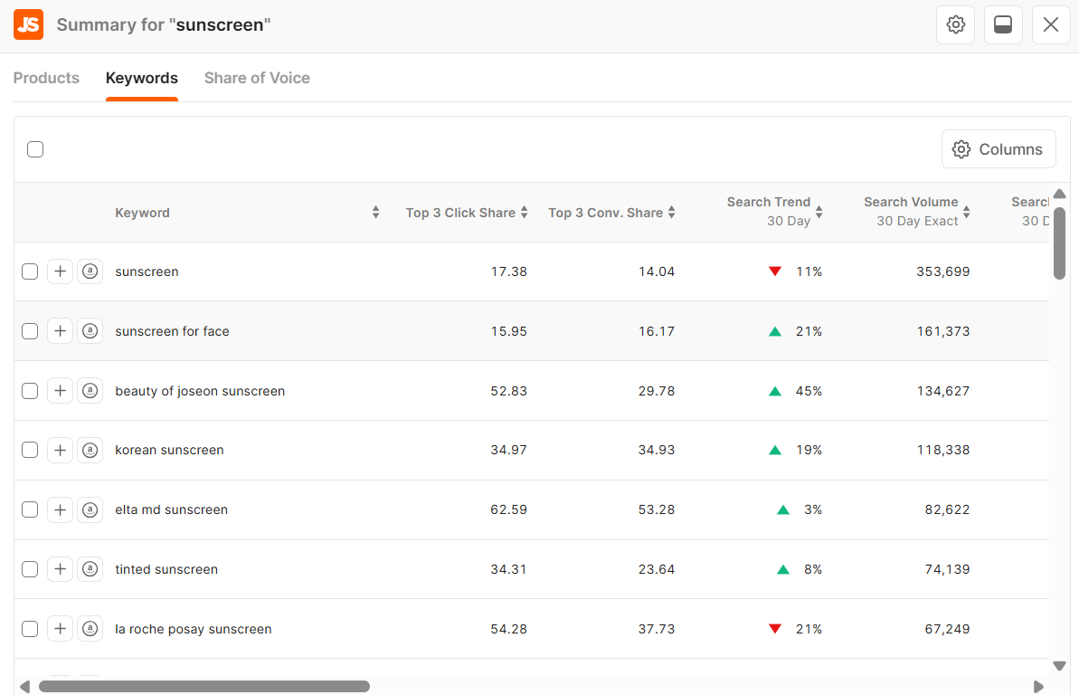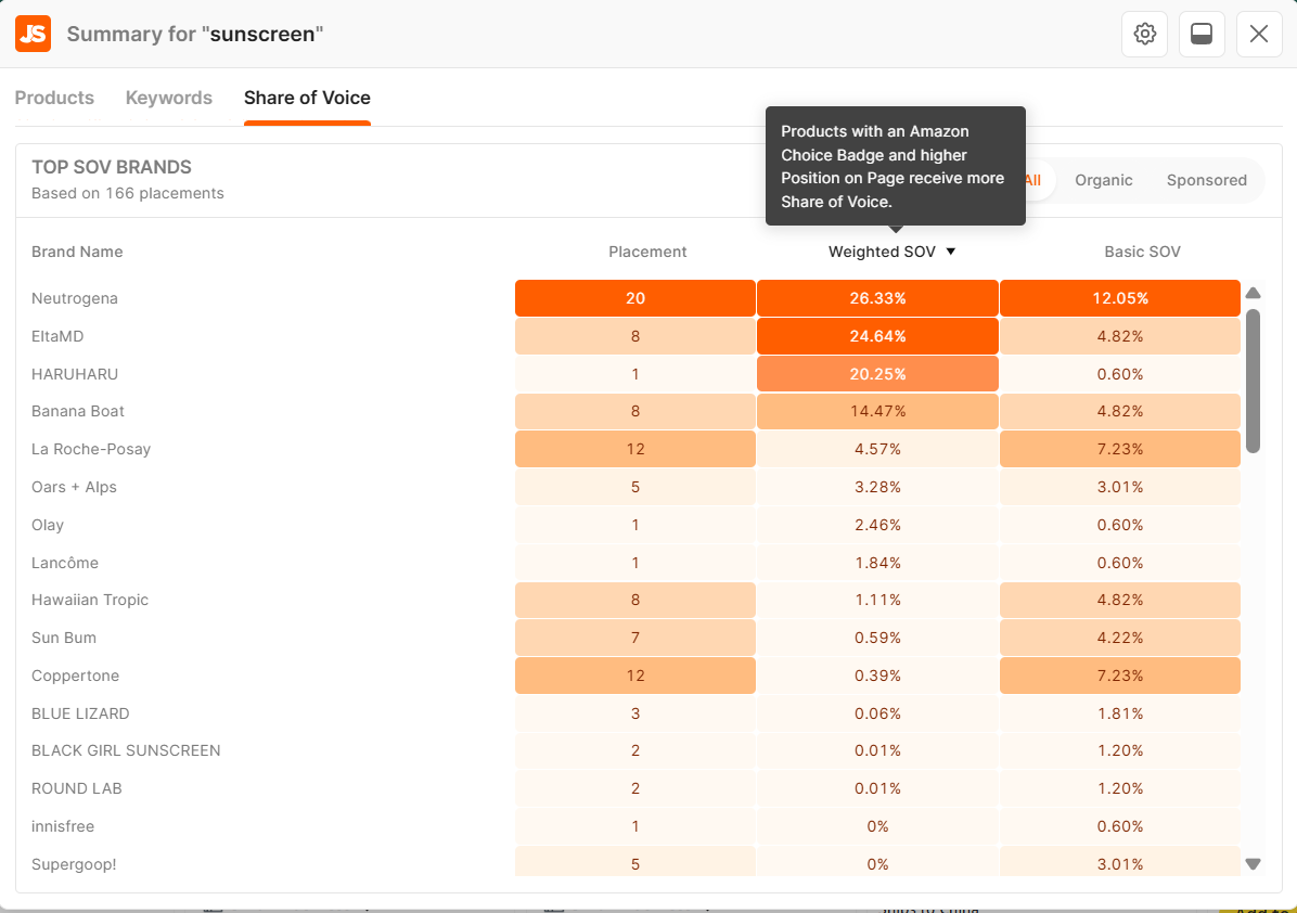 直观查看不同品牌在指定关键词下的曝光占比情况,例如在sunscreen这个词下面, Neutrogena、EltaMD 的 Weighted SOV(加权声量)、Basic SOV(基础声量)等数据一目了然;
